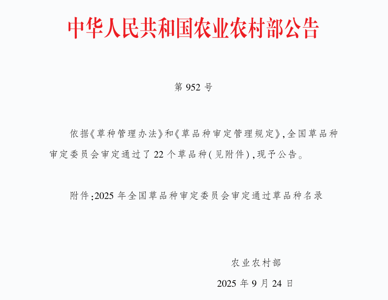 近日,农业农村部发布第952号公告,全国草品种审定委员会正式审定通过22个草品种。麻豆导航
