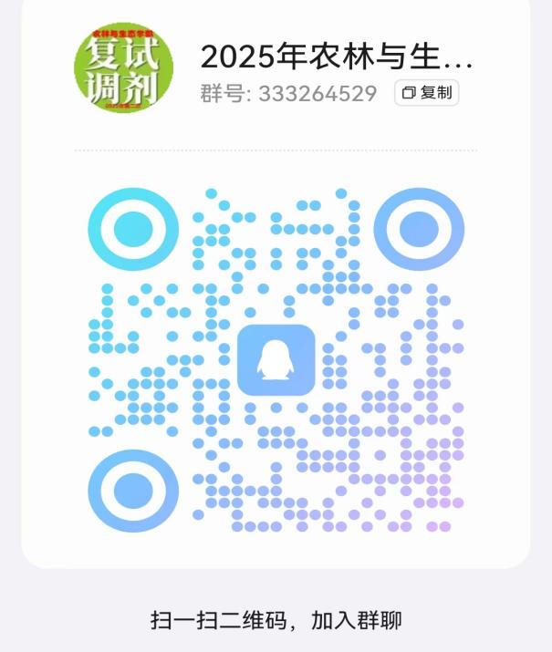 请接到调剂复试通知并确认参加复试的考生,尽快加入“2025年农林与生态学部调剂复试QQ群”(群号:333264529,群二维码见下图),以便接收相关通知。进群后,请更改昵称为“姓名+林草学院+草学+联系电话”。麻豆导航