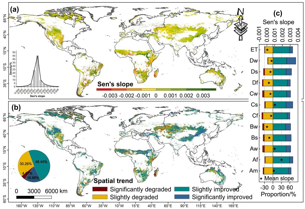 水土保持与荒漠化防治团队在《Environmental Research》(IF=7.7)发表研究,基于2001-2023年全球草原数据,借助谷歌地球引擎(GEE)和核归一化植被指数(kNDVI),揭示全球草原时空变化及驱动力。