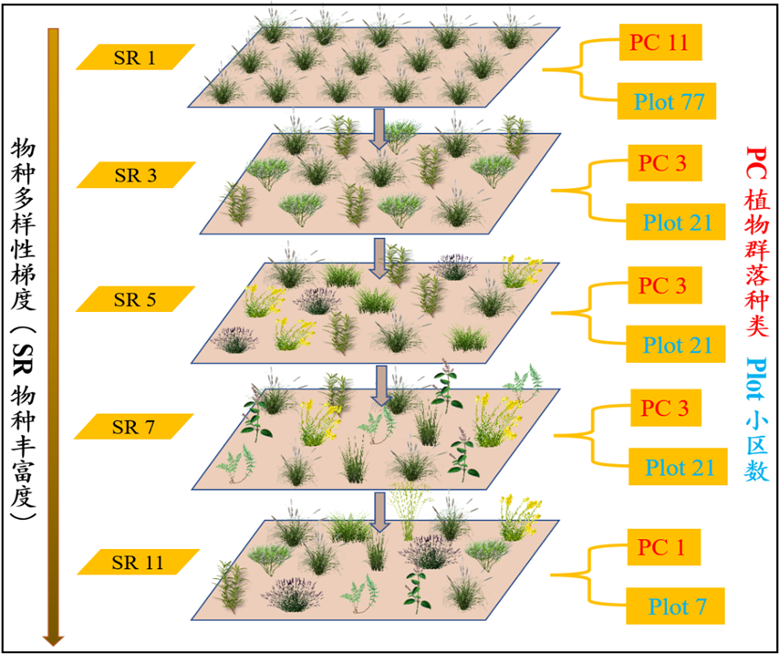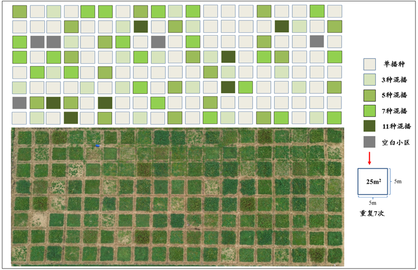 选择本土荒漠草原3个优势种和8个亚优势种进行单播和混播试验,模拟5个植物多样性梯度(单播、3、5、7、11个物种混播)和不同群落种类,采用完全随机试验设计,每个处理重复7次,小区面积为5×5=25平方米,混播组合依据实际调查优势种和亚优势种的聚居现象及物种丰富度指数,单播播种量为最大环境容纳量,混播播种量的每个物种均按照最大环境容纳量(物种最大环境容纳量按照自然植被调查物种数量、出芽率及成活率计算获得),2021年5月根据表1物种组合进行播种,定期人工去除非种植物种,以维持小区中群落种类。