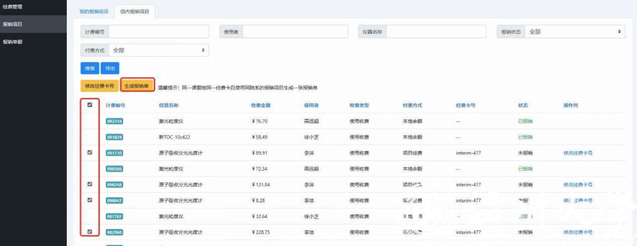 4.以上操作完成后选中修改完的数据点击生成报销单。