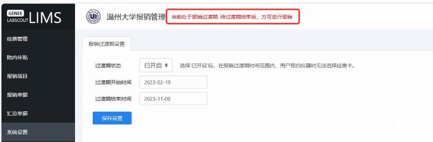 1.只有当报销管理中模式处于过渡期经费关闭时才可以使用项目经费进行测试费用的报销,当出现如上字样需联系校级平台负责人关闭此项功能后进行报销操作