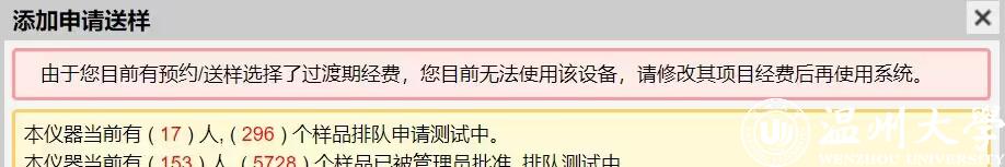 1.预约或者送样是报错如下,此时需要先确认之前过渡期经费仪器的使用情况,参照上述流程报销后才能继续预约和送样(报销单提交即可,不需要结算完成)。