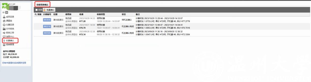 2.需要用户在个人主页的仪器收费/收费确认模块中确认计费是否已经由仪器负责人(机主)确认,机主超过三天未确认,则系统会自动确认计费,用户同理,超过使用时间三天后系统自动确认,也可在这个模块内检查是否还有需要确认的计费信息。