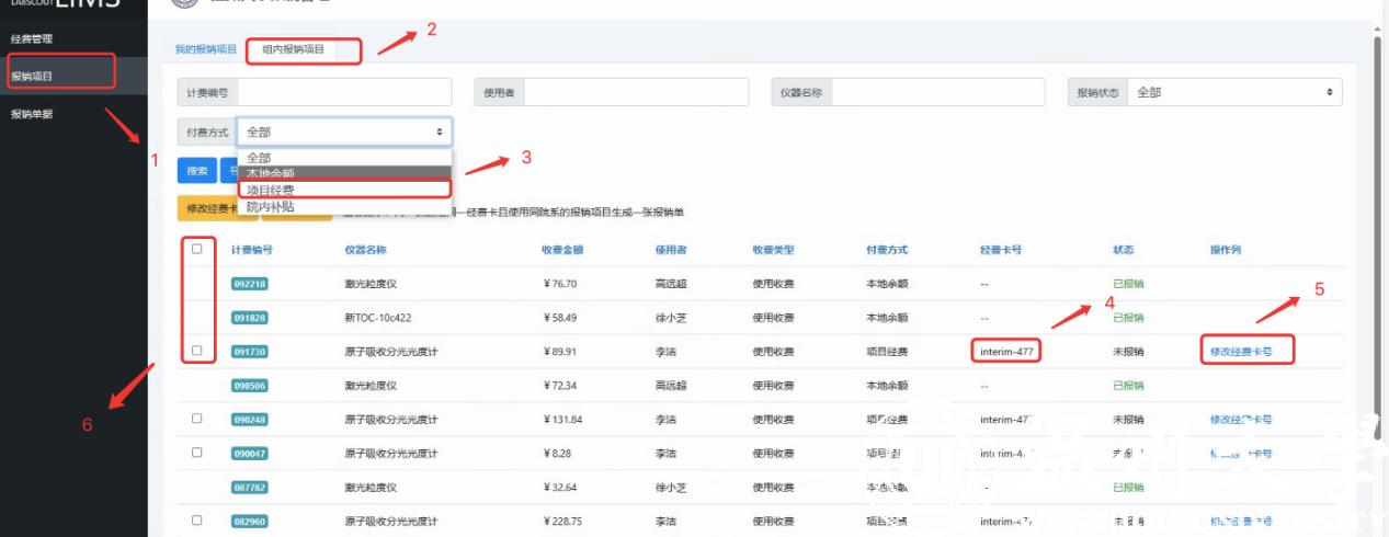 3.用户和机主费用确认完毕后,由课题组负责人进行经费信息确认,在报销管理中按照如下顺序进行点击,先点击报销项目->组内报销项目->付费方式进行筛选(校内一般为项目经费/院内补贴)->筛选后点击修改经费卡号,从过渡期经费卡改为正式经费卡,第6项可以批量选中批量修改经费卡号。