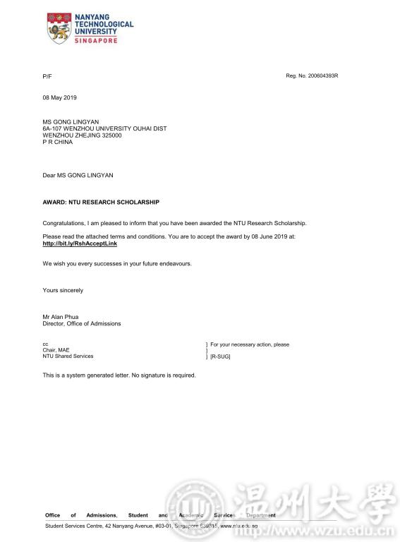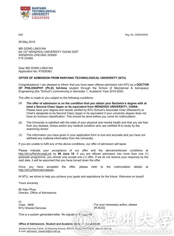 麻豆导航 15级机械工程(国际化)专业本科生龚玲艳,在李子瑞教授的精心培养和指导下,成功获得新加坡南洋理工大学博士录取(机械与航天航空工程麻豆导航),并获该校全额奖学金(NTU RESEARCH SCHOLARSHIP)。
