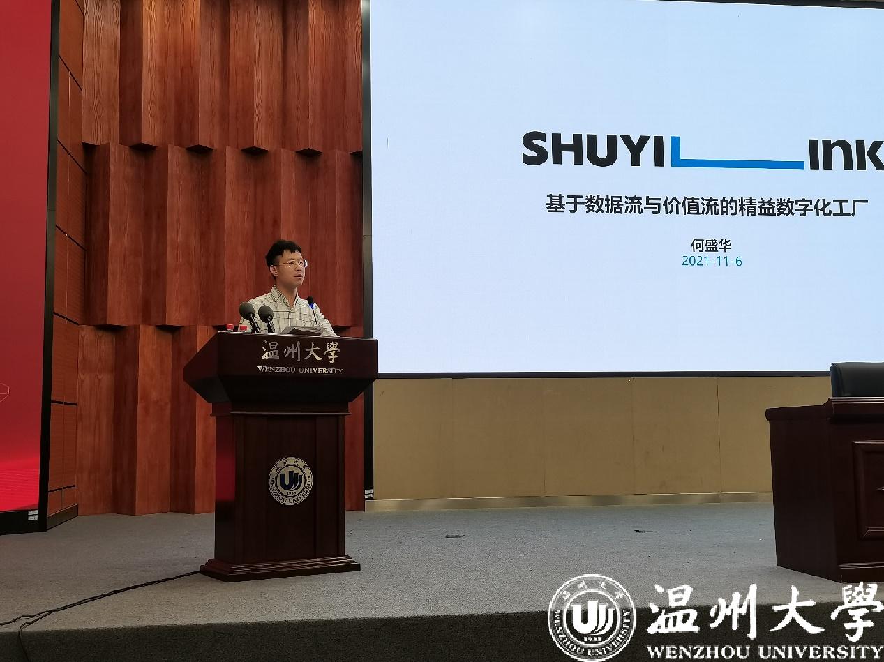 紧接着,由何盛华先生做出工业工程在现代企业运用的讲座分享,何先生先向同学们分享的自己的工作经历,从中强调了互联网时代智能制造与数字化的重要性,用工业的历史发展为同学们举例,使同学们明白了工业工程在未来可以凭借其系统性的考虑,运用合理的技术,达到降低成本,提高质量的目的。同时何先生也介绍了数益工联团队研发的基于数据流与价值流的精益数字化工厂,让同学们了解到了前沿工厂的先进技术。最后,何先生也向同学们介绍了自己的宁波数益工联科技有限公司,欢迎同学们今后前去实习应聘。在何先生的精彩发言之后,同学们响起了热烈的掌声。