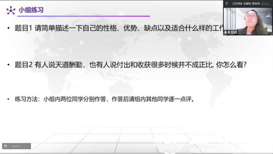 在讲座期间朱老师也邀请同学模拟面试练习,同学们踊跃发言,将自己心中的所想所思进行了回答,朱丽莉老师对同学们的回答给予了肯定,同时对不足之处予以点评。
