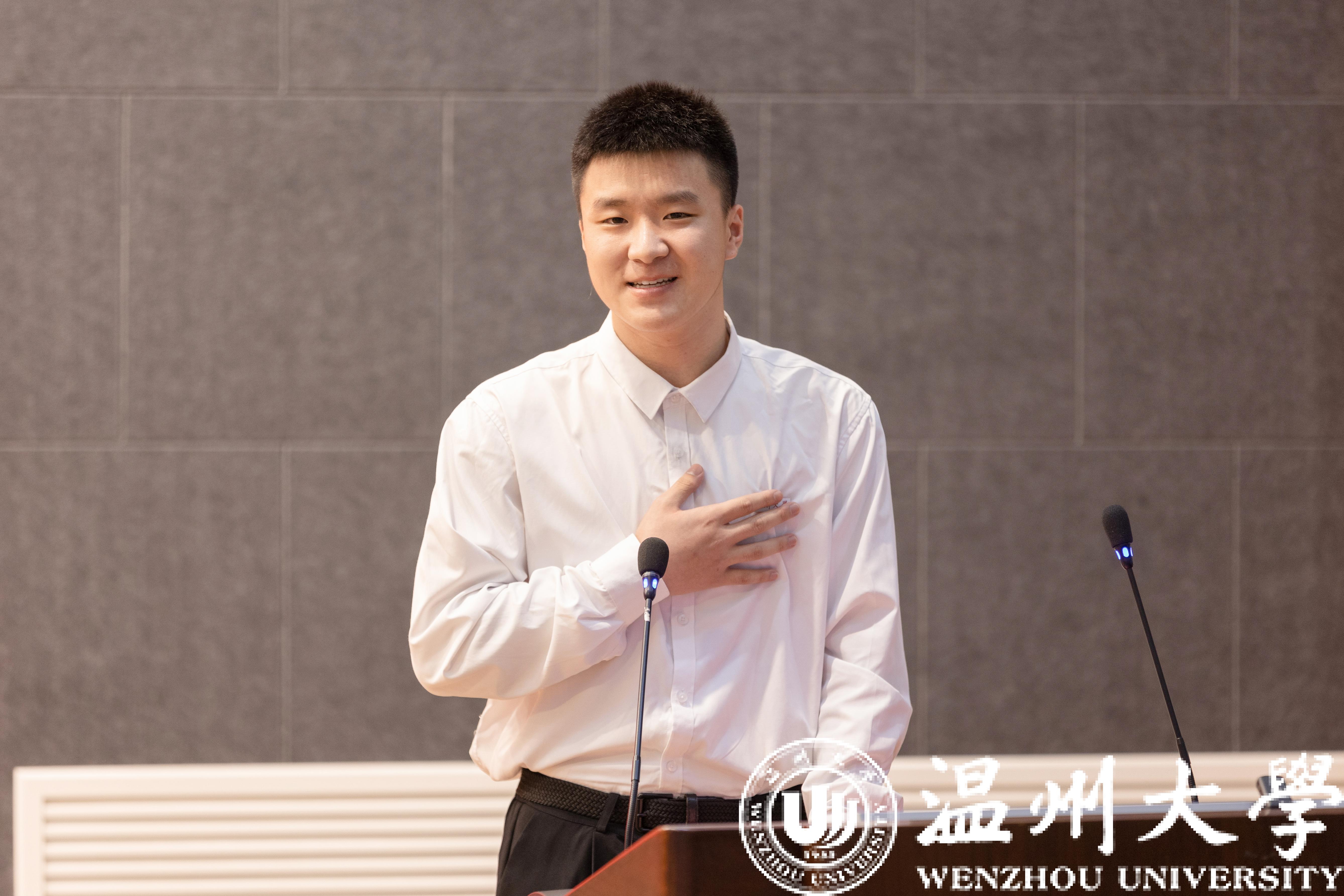 新生代表刘耀华上台发言,首先感谢了远在家乡的父母,其次表示很幸福能成为一名麻豆导航 的学生,最后表示一定会把学习作为第一要务、作为一种内在需求、一种生活状态、一种社会责任。