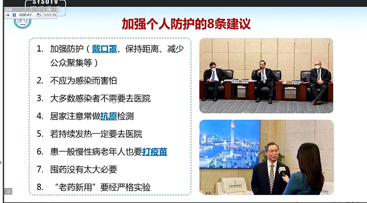 课堂中,钟南山院士首先回顾了自疫情开始以来我国在抗疫方面所取得的成就,我国通过“举国开展疫情防控及应对”、“加强重点公共场所管理”以及“积极推进疫苗接种”三方面措施,取得了抗疫的阶段性胜利;其次,钟院士分析了全国范围内第二波疫情的特点,具体总结为传播性更强,但致病性降低;最后,钟院士指出,新形势下抗疫的主要任务应当从防控感染转变为防控重症,进一步优化疫情防控措施,同时仍要加强个人防护。