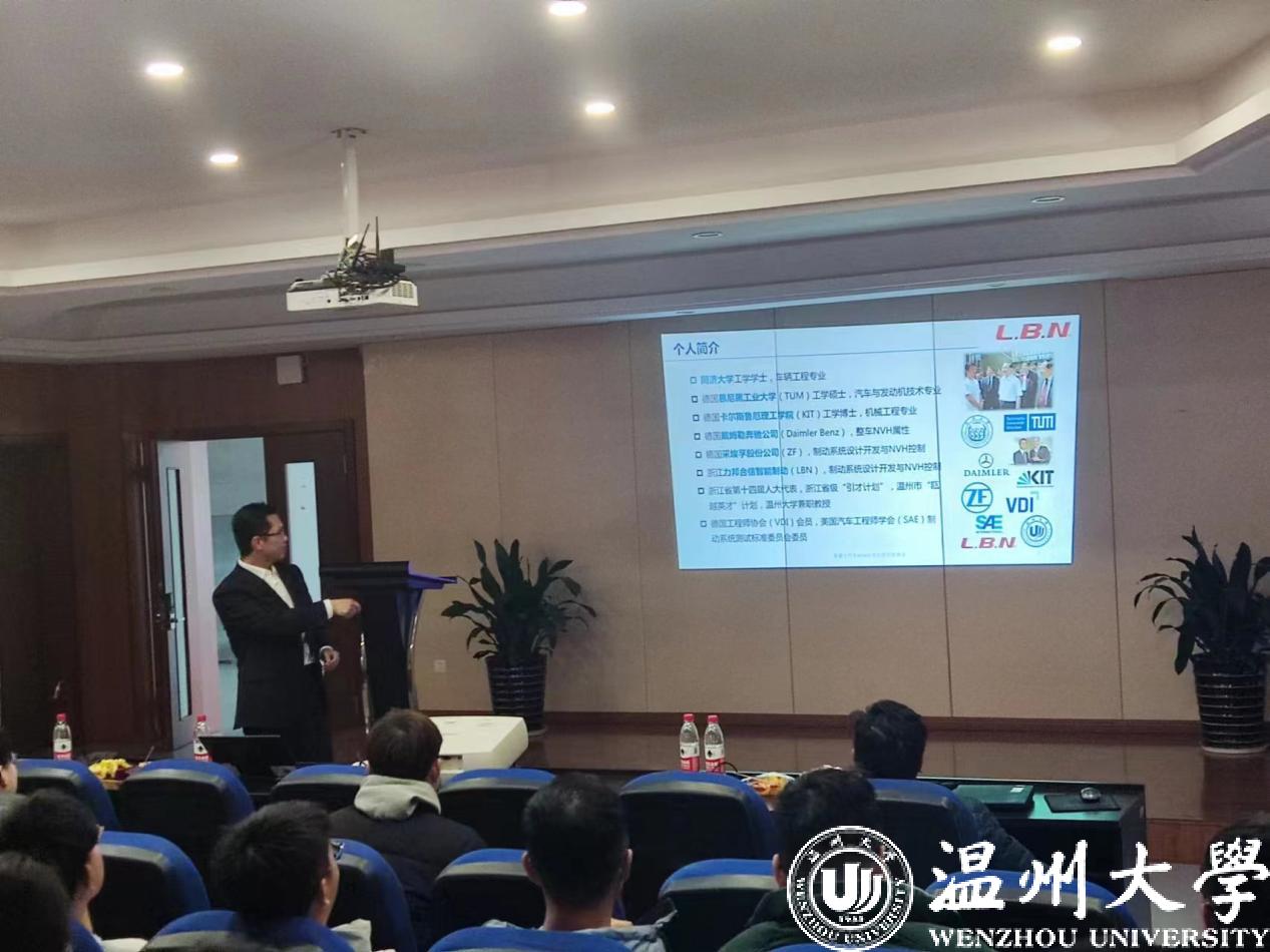 蔡博士主要从事车辆制动系统设计开发与振动噪声控制。拥有10年德国汽车行业研发经验。德国工程师协会 (VDI)会员美国汽车工程师学会 (SAE) 制动系统测试标准委员会委员。他为我院师生详细讲授了《汽车NVH技术的现状和展望》。汽车的NVH特性是研究如何解决和降低车辆运行中的噪声、振动、舒适性的问题。针对近些年来汽车振动与噪声控制技术领域的最新进展及发展趋势,蔡博士论述NVH技术的发展、研究方法和未来的发展趋势,为在场研究生提供必要的信息和指导。