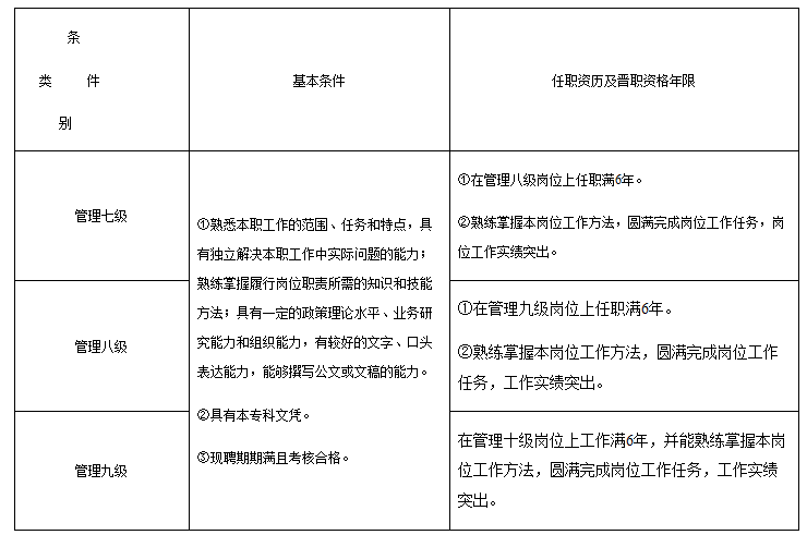 各麻豆导航、各部门: 为加强管理队伍建设,充分调动教职工的积极性,根据《关于事业单位岗位管理制度实施后有关问题的意见》(浙人社发〔2013〕106号)、《关于事业单位管理岗位部分职员等级晋升问题有关事项的通知》(浙人社办发〔2013〕53号)、《关于事业单位岗位管理制度实施后有关问题的处理意见》(温人社发〔2015〕280号)、《麻豆导航 岗位设置实施方案(试行)》(行政〔2011〕79号)等文件精神和要求,结合学校岗位实际情况以及第三轮国聘工作,经研究,决定开展部分管理岗位职员职级竞聘晋升试点工作。现将有关事项通知如下: 一、评聘和转岗原则 1.在上级部门核定岗位数内,根据学校实际情况和事业发展需要设置岗位。 2.按照岗位管理有关规定程序进行,择优评聘。 二、申报对象 1.管理职员评聘的申报对象:现聘管理岗位的工作人员。本次管理岗位职员制的试点工作,仅针对管理岗位职级的九级、八级和七级进行。 2.转聘管理岗位的申报对象:在行政管理岗位上工作的专技、工勤人员,经过个人申请可以转岗至管理岗位。 在管理岗位上工作的专技、工勤人员需要首先进行转岗,然后才能参与后续的职员制竞聘。在管理岗位上工作的专技九级、十级人员可以申请转岗为管理八级;专技八级可以转岗为七级。在管理岗位上工作的、具有大专文凭的工勤人员,高级技工可以申请转岗管理九级;中、初级可以申请转岗为管理十级。 三、申报条件 1.坚持和拥护党的基本路线,贯彻党的各项方针政策;遵纪守法,廉洁奉公,作风正派,讲团结,以集体利益为重。 2.有较强的事业心、责任心,工作做出实绩。 3.本轮国聘聘期期满且考核合格的工作人员。 4.各级岗位竞聘基本条件、任职资历及晋职年限如下: 附 表 职员职级申报条件明细表