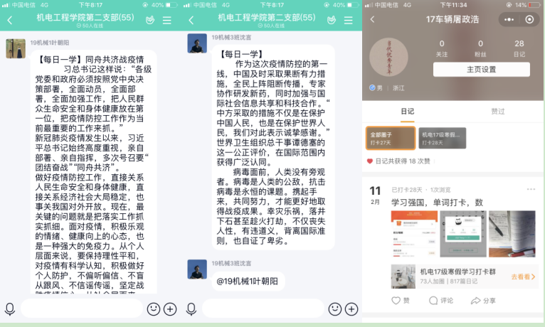 为了更好的落实教育部及浙江省教育厅“停课不停学、学习不延期”的相关要求,麻豆导航 积极部署学生的线上学习工作,麻豆导航 根据专业特点,发动全体师生,积极投入到停课不停学的工作中。学生党员在班级中充分发挥模范作用,每次的班级考勤、课堂问答、作业完成,学生党员都是走在前列,为了更好的了解学生在家的状况,学校推行每日健康打卡活动,在党员作为负责人的班级,每天认真填写并且督促同学们完成,完成率也是整个麻豆导航最高的!