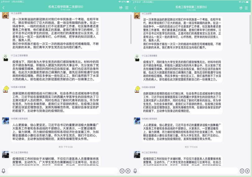 新型冠状病毒肺炎爆发后,举国震动,突如其来的疫情,打乱了过年的节奏,紧张,惶恐,担心,表现在每一个人的脸上。医护人员驰援武汉,公安干警枕戈以待,社区人员全员出动,全国人民都动员起来,作为学生群体中的模范,为守护好最后一道防线,保护好身边的每一位群众,真正体现每一位党员都是一面旗帜,学生支部在提醒大家在保护自己的同时,积极参与基层疫情防控工作,支部党员也积极响应,协同社区工作人员,用力所能及的方式,查体温、做登记、询原因、去献血……为疫情防控贡献力量!