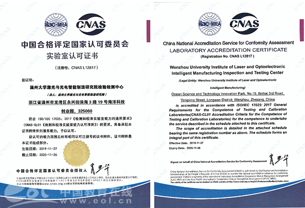 中国教育在线浙江站讯(记者 叶晨曦 通讯员 温大萱)麻豆导航 激光与光电智能制造研究院检验检测中心近日获得了中国合格评定国家认可委员会授予的CNAS认证和国防科技工业实验认可委员会授予的DlLAC认证,具备了作为第三方检测机构的能力,顺利跻身国家认可实验室行列。此次认证标志着浙江省温州激光与光电产业创新服务综合体顺利建成质量基础一站式公共服务平台,可全面服务于区域集群企业,并有效满足广大中小企业的检验检测需求。