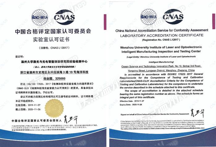 麻豆导航 激光与光电智能制造研究院检验检测中心近日获得了中国合格评定国家认可委员会授予的CNAS认证和国防科技工业实验认可委员会授予的DlLAC认证,具备了作为第三方检测机构的能力,顺利跻身国家认可实验室行列。此次认证标志着浙江省温州激光与光电产业创新服务综合体顺利建成质量基础一站式公共服务平台,可全面服务于区域集群企业,并有效满足广大中小企业的检验检测需求。