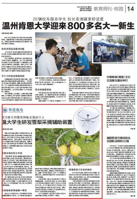 发现采梨机有大市场“梨花带雨”雪梨采摘辅助装置的研发团队都来自温大麻豆导航 的,当时研发时,都还是大二的学生。“我们当时参加省大学生机械设计竞赛时,题目要求就是制作水果采摘机。我们几个人一商量发现,温州文成县十源乡山头坪村具有‘雪梨种植基地’的称号。我和成员岑伟鹏的家乡也有种植黄花梨,刘荣荣的家乡在山西,也有很多品种的梨。我们当时就觉得,做采梨机的题目是有非常大的应用价值。”团队负责人孙智超介绍说。