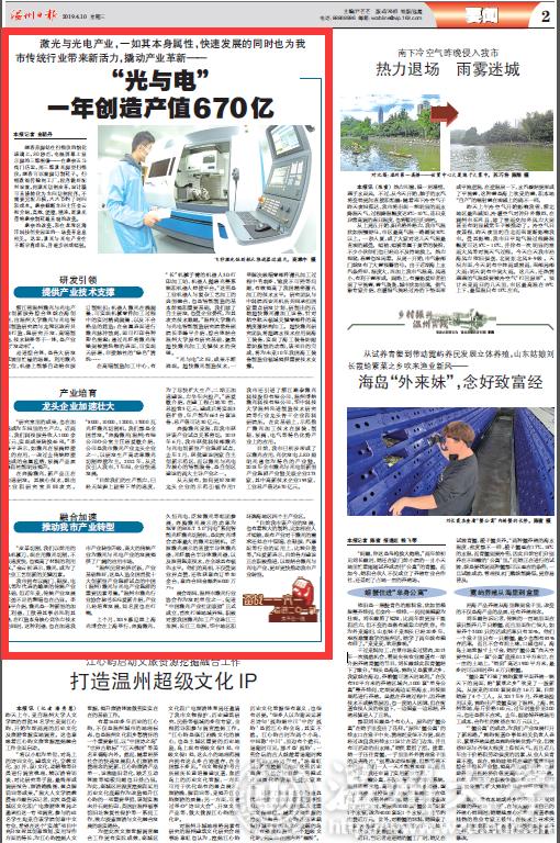 “温州民营经济活跃,产业基础较好,这是入选全国首批十大创新型产业集群试点的中国(温州)激光与光电产业集群的重要因素考量。”温州市激光行业协会秘书长冯爱新介绍,产业几经培育发展,知名度也在打响。