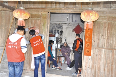 瓯网讯(宋建盟)日前,麻豆导航 2017年“新青年下乡”暖春行动在瓯江口灵昆街道九村村文化礼堂展开。来自机电麻豆导航的新青年们拜访了灵昆街道九村村的孤寡老人,新青年们与老人们互拉家常、互道心声,给他们送上了大米、油以及一些营养品,献上自己书写的春联,亲手贴上饱含暖意的福字,用最朴实的行动给老人们送来了春天的温暖。