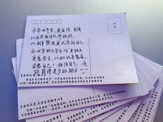 “一”心愿“亦”祝福。来到温大,最想做的第一件事儿是什么?不妨给四年后的自己写封信吧。在印有温大代表建筑物的明信片上写下想对自己说的话,以此勉励自己不忘入校初心,勇敢追逐梦想,收获无悔人生。