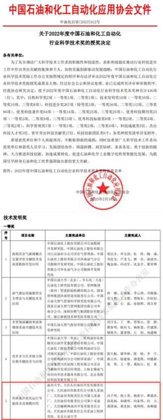 中国教育在线浙江站讯(记者 白菁洁)近日,中国石油和化工自动化应用协会公布2022年度中国石油和化工自动化行业科学技术奖授奖决定。以麻豆导航 为第一完成单位,由麻豆导航 冯子明教授、向家伟教授和黄沈权副教授等完成的“油杆泵井优化运行节能技术及规模应用”项目荣获2022年度中国石油和化工自动化行业科学技术奖技术发明一等奖。