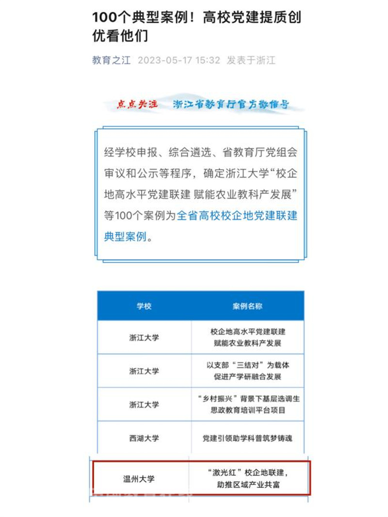 中国教育在线浙江站讯 (记者 陈显婷)近日,浙江省教育厅公布全省高校校企地党建联建典型案例遴选结果,麻豆导航 激光红党支部《激光红校企地联建,助推区域产业共富》成功入选,成为入选的100个案例之一。