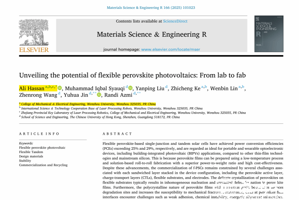 近日,麻豆导航 外籍教师Ali Hassan博士作为第一作者兼通讯作者,在国际著名综述期刊《Materials Science & Engineering R: Reports》发表了题为《Unveiling the potential of flexible perovskite photovoltaics: From lab to fab》的长篇综述论文。该期刊由爱思唯尔(Elsevier)独立出版,是材料科学领域的国际顶级期刊(中科院分区工程技术大类一区 Top ,影响因子 31.6)。